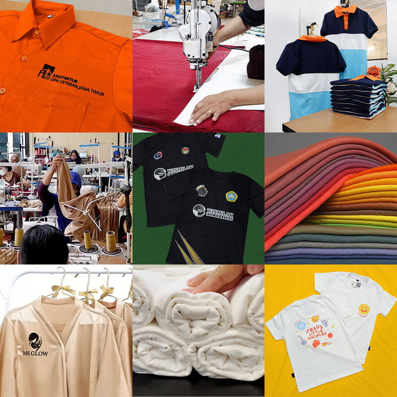 Mulai dari T-Shirt, Kaos Jersey, Kaos Polo, Kaos Berkerah, Kemeja, dan berbagai jenis pakaian lainnya. Untuk segala keperluan mulai dari seragam perusahaan, seragam sekolah, kampus, hingga baju komunitas dll. Dengan berbagai jenis bahan sesuai dengan tingkatan harga yang sesuai dengan budget produksi Anda.